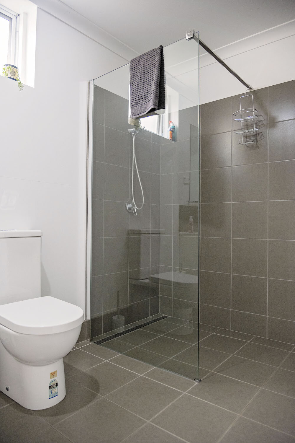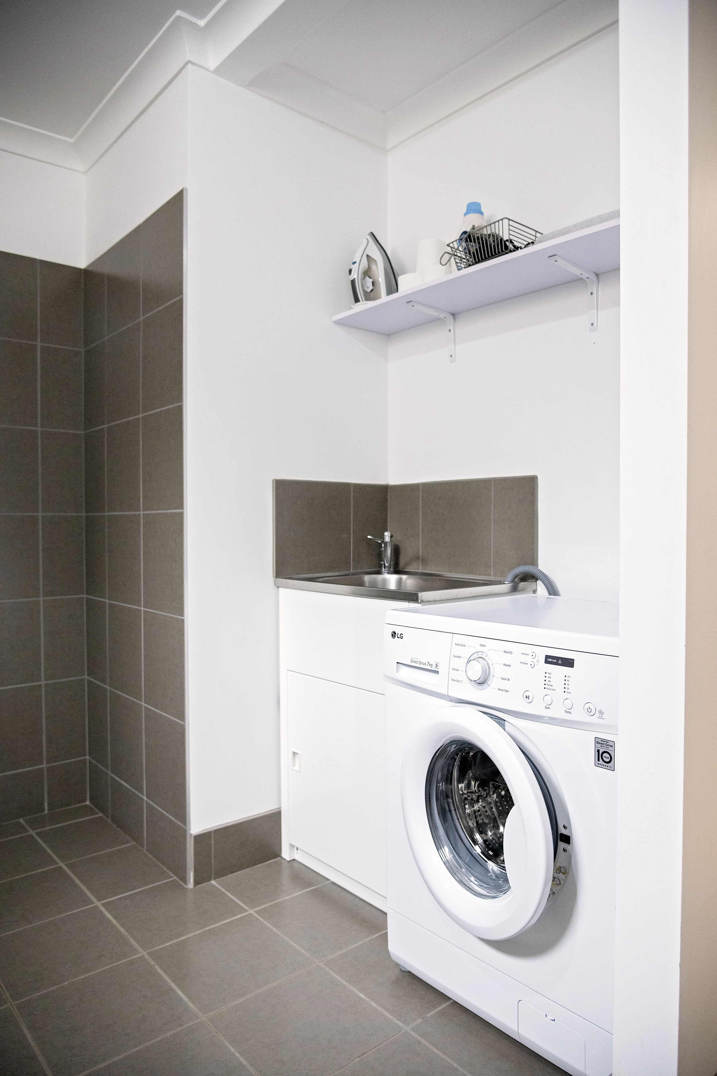 Large bathroom with walk in shower and laundry facilities( washing machine)